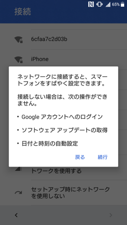 • [接続]画面では、[セットアップ時にネットワークを使用しない]を選択します。選択すると注意事項が表示されますが、[続行]を選択してください。