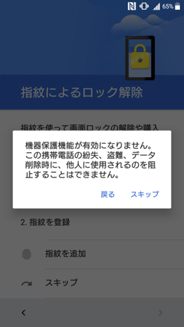 • [指紋によるロック解除]について聞かれますが、何も設定せず[スキップ]を選択します。選択すると注意書きが表示されますが、[スキップ]を選択してください。