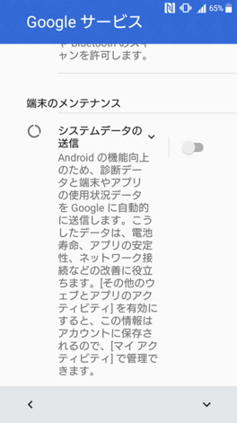 • [Googleサービス]についての設定は、端末のメンテナンスの[システムデータの通信]がONになっていますが、これをOFFにして次へ進んでください。