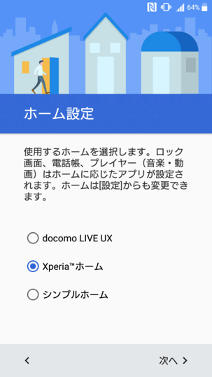 [ホーム設定]画面では、[Xperiaホーム]を選択し、次へ進んでください。
