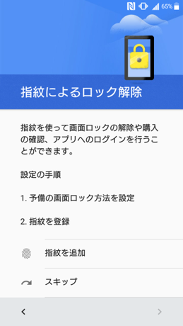 [指紋によるロック解除]について聞かれますが、何も設定せず[スキップ]を選択します。選択すると注意書きが表示されますが、[スキップ]を選択してください。