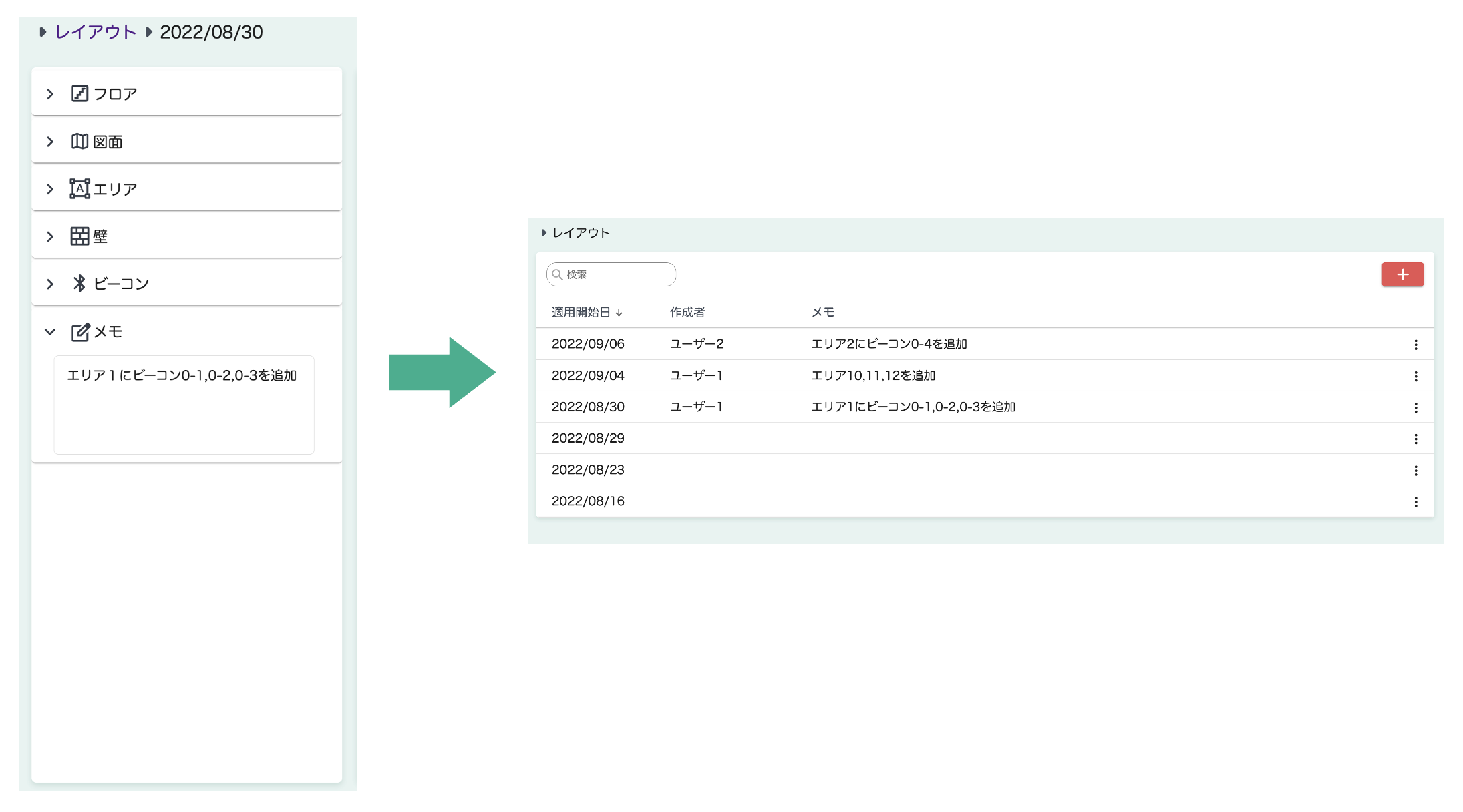 リリース 2.22.32024年5月7日 · 約1分💅 機能改善 サイドバー サイドバーの表示方法を改善しました。 サイドバーの表示状態を保存し、折り畳まれた状態で終了した場合、次回使用時も折り畳まれた状態で表示されます。 レイアウト画面 レイアウト作成・編集時に登録済みのエリア、ビーコン数を表示する機能を追加しました。 ビーコンの位置、個数の確認などにご利用ください。 ヘッダー ヘッダーで言語の切り替えが可能になりました。日本語と英語が選択できます。