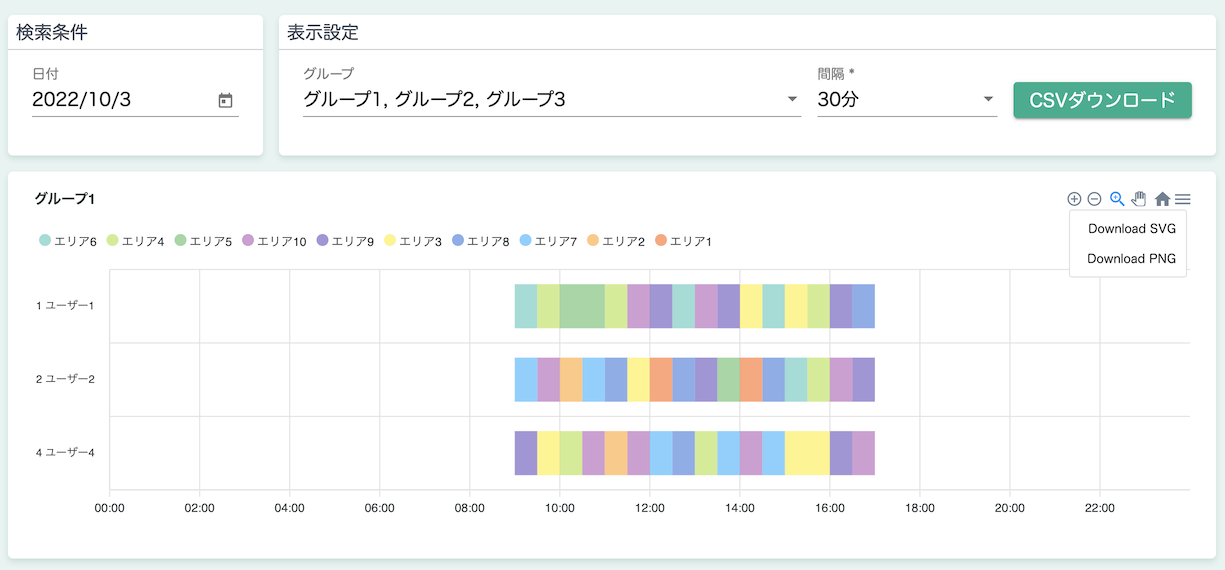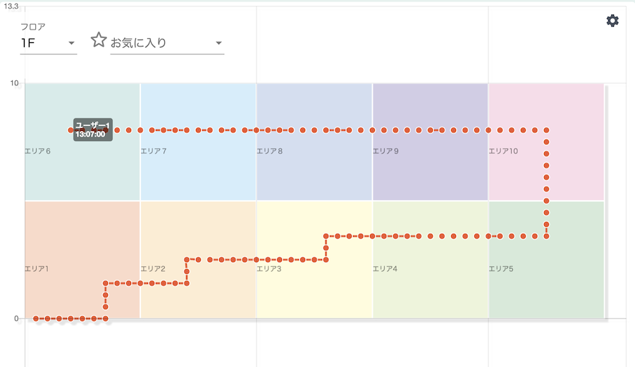 以下の設定で確認ができますのでこちらをご利用ください。項目 現行の時系列での設定 時系列 動線 + 再生 動線 動線 + 時間帯 ヒートマップ ヒートマップ + 時間帯 -